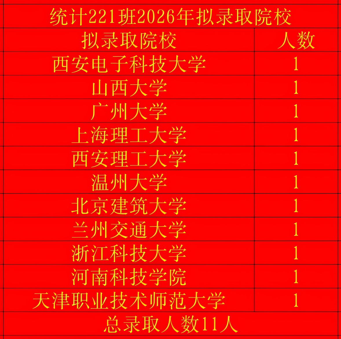 统计221班11名学子成功上岸,4人省内录取,7人省外深造,省外录取率63.6%。班级学风浓厚、目标明确,多名学子考入省外高层次院校,成为学院考研升学的标杆班级。