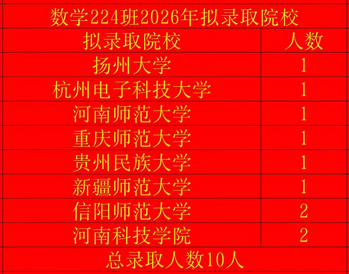 数学224班10名学子圆梦读研,省内省外录取各半,升学渠道均衡多元。班级学子互帮互助、共同进步,用坚持与汗水书写青春答卷。