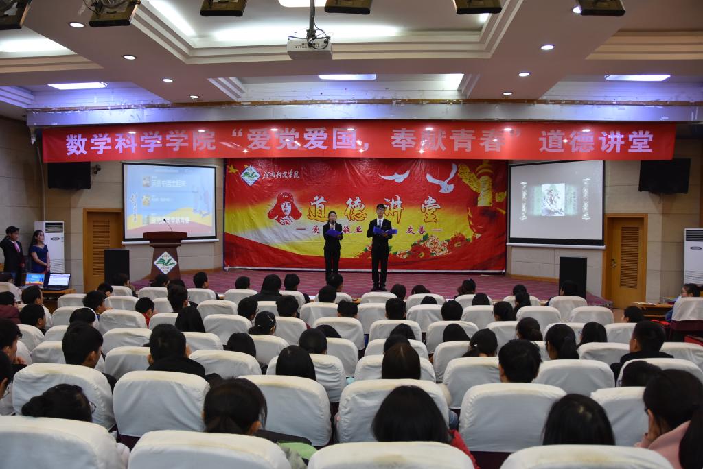 此次道德讲堂以“爱党爱国,奉献青春”为主题分为“爱国志,发自省”,“学模范,谈感悟”,“颂祖国,陶身心”,“起倡议,践我行”四个环节,活动首先在《歌唱祖国》的大合唱中拉开帷幕,随后,大家一起分享了《黄大年模范事迹》的故事、共同观看《中国的红色梦想》、《2016年度感动中国人物——孙家栋》两个视频,接下来,诗歌朗诵《我骄傲,我是中国人》、爱国主义小品剧《一代宗师》、手语舞蹈《国家》更是把对党的赞美和祖国无限热爱之情表达的淋漓尽致,使整个活动现场的气氛达到了高潮。最后,学生代表王毓上台发出倡议,倡议青年学子刻苦学习,掌握本领,热爱党和国家,共同为实现伟大中国梦而无私奉献、不懈奋斗。