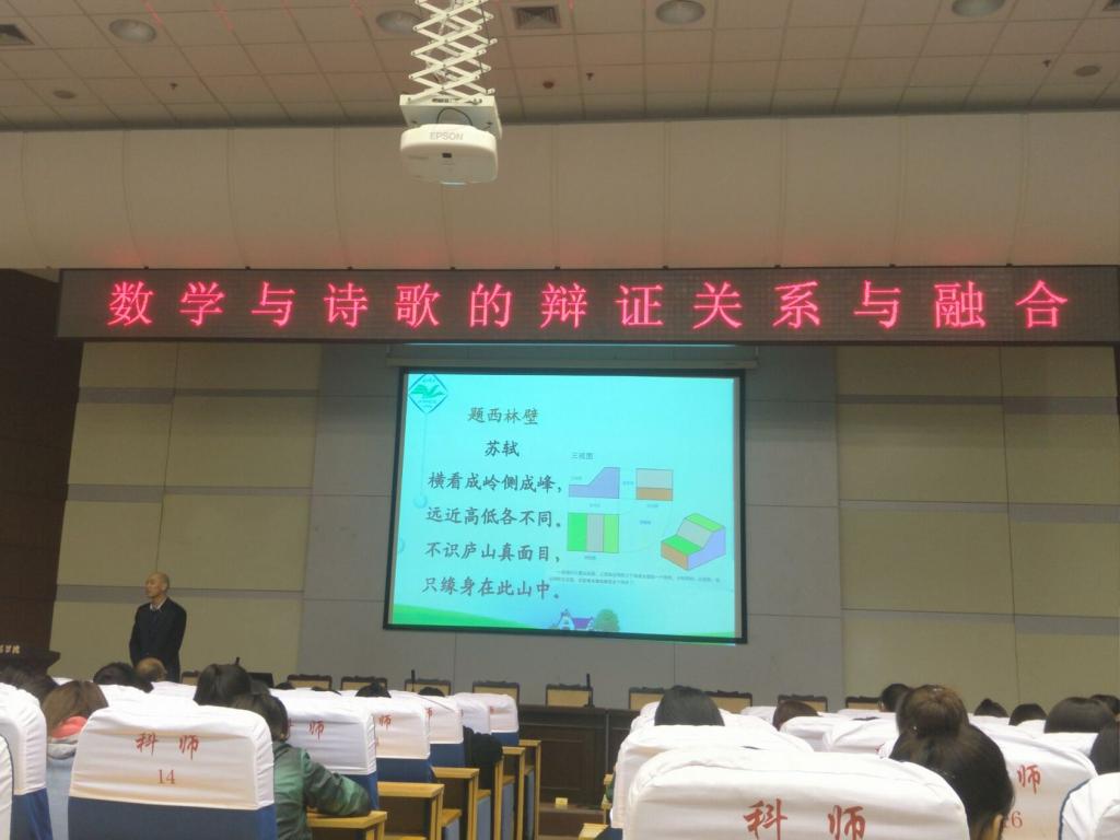 9日下午2点半,马宝林老师在该校学术报告厅做了一场关于“数学与诗歌的辩证与融合”的学术报告。该校师生近400人聆听了报告,马老师以举例的方式由数学的起源过渡到数学与诗歌的辩证和融合,将数学与国学集合起来,展现了数学多面性和灵活性,使同学们对数学有了深层次的认知。此次报告以数学情诗结尾,形式新颖,彻底打破大家对传统教学模式认识,从而体会到数学的魅力。