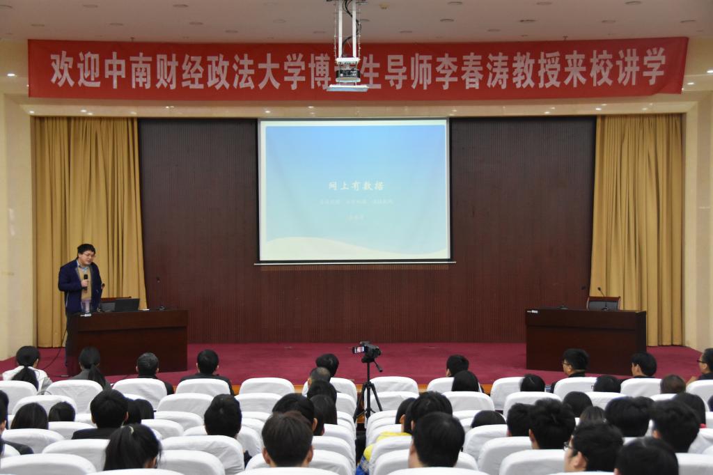3月13日下午三点,WG娱乐(中国)唯一官方网站 特邀中南财经政法大学博士生导师李春涛教授于我校行政楼308多功能报告厅作学术报告会。WG娱乐(中国)唯一官方网站 院长张万琴,党委副书记胡付广,以及部分师生共200余人参加了本次报告会。报告会由WG娱乐(中国)唯一官方网站 院长张万琴主持。