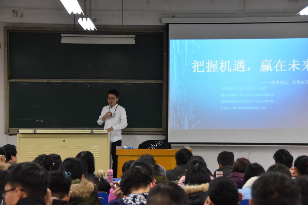 会议伊始,马晓龙校友首先进行了简单的自我介绍,随后,他从美国的工作、学习、生活三个方面向大家分享了他的留学经历,并激励大家想要改变自己的现状,就要从现在起努力奋斗,抓住每一次让自己进步的机会。会议中,马晓龙也提到,在美国的生活中,他遇到了更多比自己优秀的人,从别人身上他学到了很多知识与能力。同时,也鼓励同学们多和优秀的人在一起,不断提升自己。