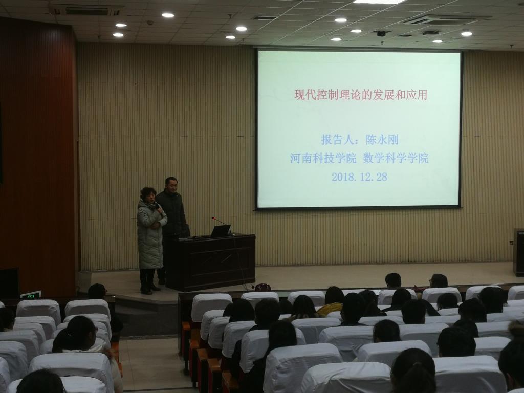 12月28日,WG娱乐(中国)唯一官方网站校级特聘教授陈永刚博士在新图书馆一楼报告厅为大家做了一场题为“现代控制理论的发展和应用”的报告,报告由WG娱乐(中国)唯一官方网站 院长张万芹主持,WG娱乐(中国)唯一官方网站 200余师生参加了报告会。