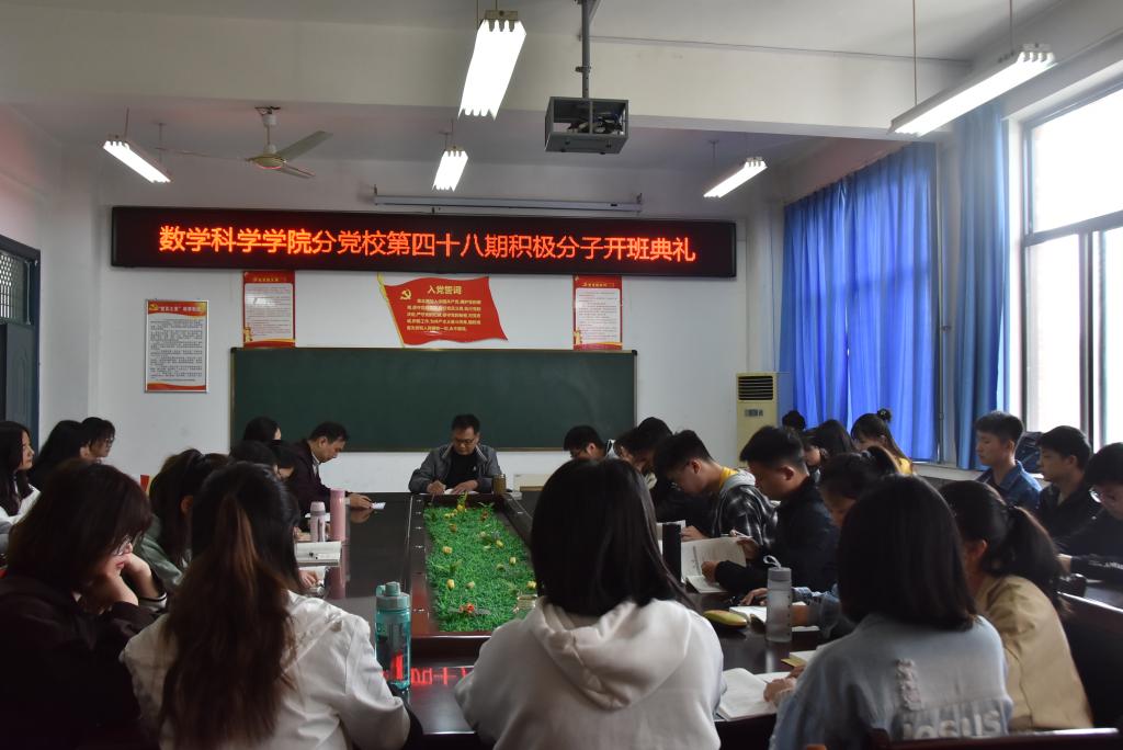 第四十八期入党积极分子培训班培训计划》,并结合实际解读指导思想、培训目的、培训措施、培训内容,并对培训班的纪律做了重点强调和要求。随后,本期培训班学员代表何璐瑶同学发言,她从思想,学习,生活和行动四个方面做了汇报,并代表全体积极分子表态将会坚定信念,端正入党动机,严格遵守学习纪律,争取早日加入中国共产党。
