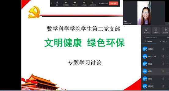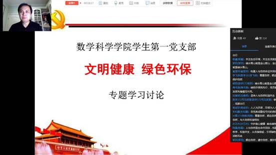 学习教育活动中,贾普君老师、刘喜明老师采用视频会议和网络直播的方式,组织党员学习习总书记关于生态文明建设的重要论述,引导党员积极践行“八个带头”,结合校园文明创建,迅速在校园内营造起文明健康,绿色环保、从我做起的浓厚氛围,在今后校园文明建设中起带头作用。活动中,贾老师老师还重点领学了习总书记3月2日在北京考察新冠肺炎防控科研工作时发表的重要讲话内容,通过学习讲话引导党员深刻认识到科学发展和技术创新对疫情防控乃至现代生活方方面面的重大意义。