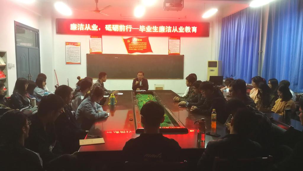 11月11日,WG娱乐(中国)唯一官方网站在学院楼会议室开展毕业生廉洁从业教育活动。2021届毕业生代表50余人参加本次活动,活动由学院党委纪检委员、团委书记贾普君主讲。