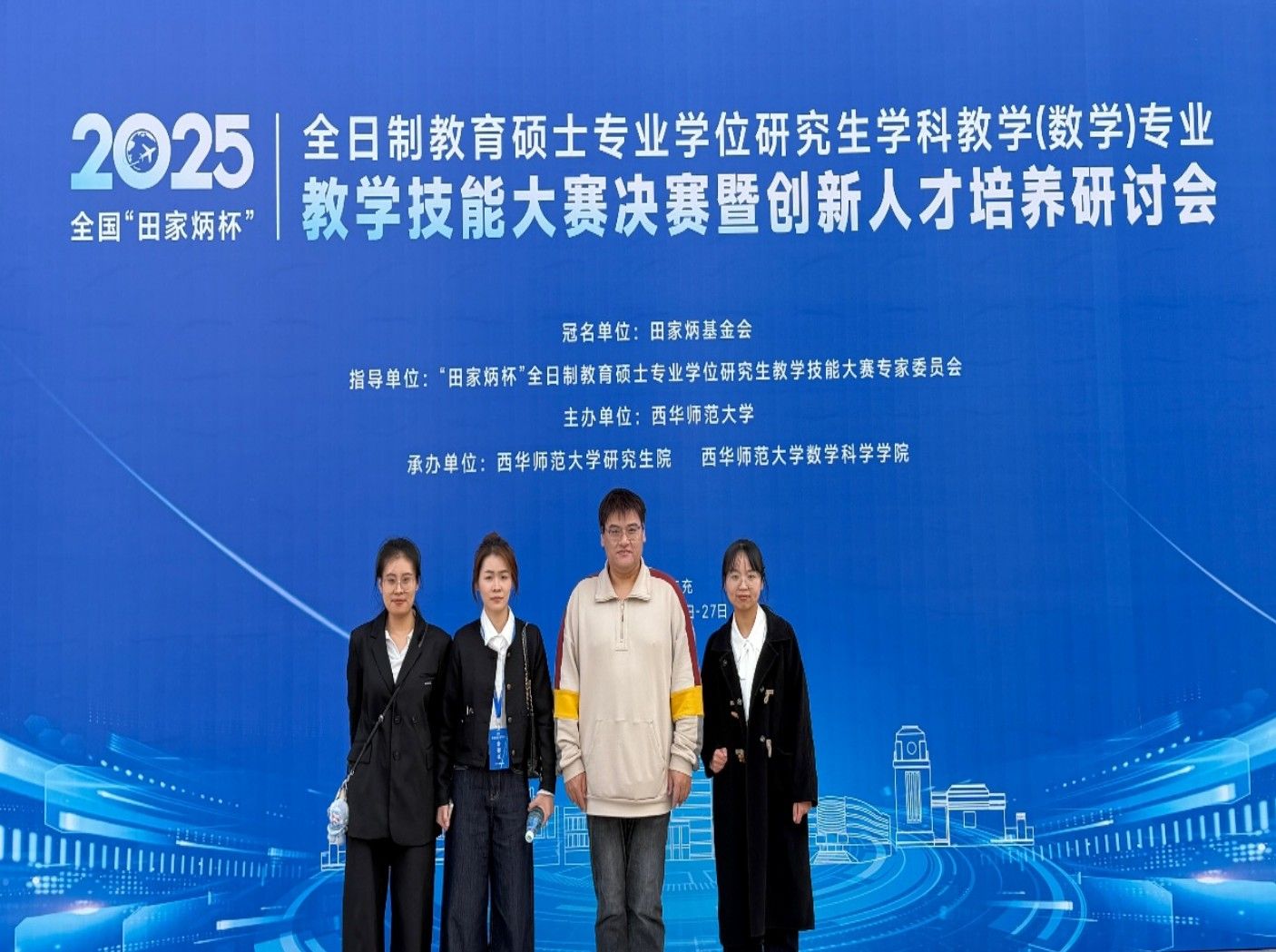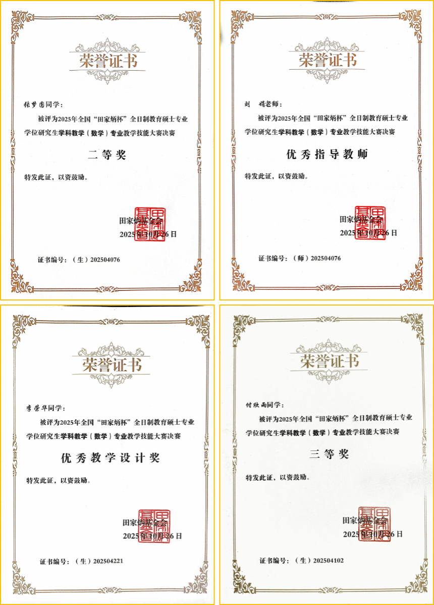 10月24日至26日,2025年全国“田家炳杯”全日制教育硕士专业学位研究生学科教学(数学)专业教学技能大赛决赛在西华师范大学举行。WG娱乐(中国)唯一官方网站2024级研究生张梦圆、付欣雨、李荣华在陆博老师的带领下,与全国113所高校280名晋级选手同台竞技,最终荣获二等奖1项、三等奖1项、优秀教学设计奖1项,刘娟老师获“优秀指导教师奖”。